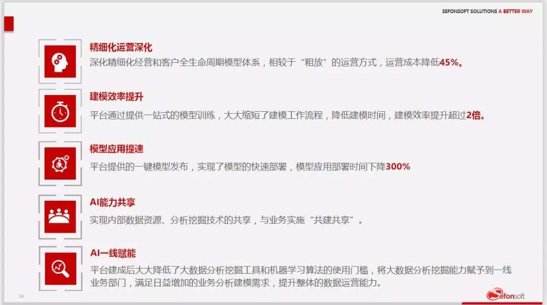 平台提供100余种分析算法,并提供自定义算法能力,满足各类业务场景;建模过程无需编程,采用拖拽算子的可视化操作方式即可完成海量数据的价值挖掘;以可视化的方式对模型训练进行评估和对比,方便业务人员更快确定最佳预测模型,提供高可信度的答案。