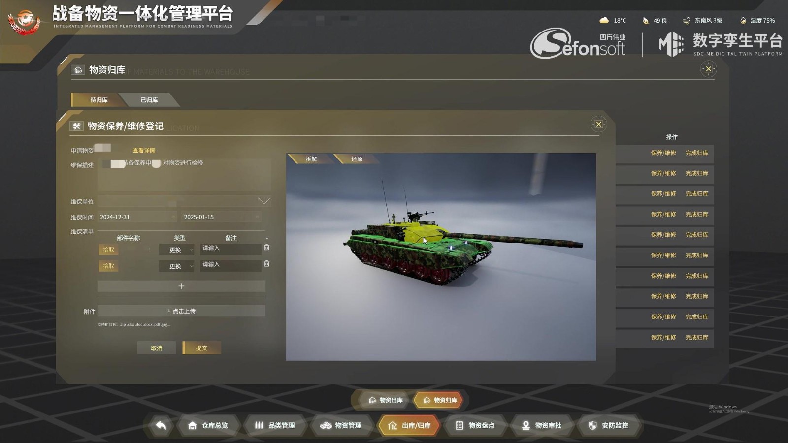 结合RFID批量扫描与人工复核双校验机制,支持物资出库操作确认、归库入库登记以及维保登记。同时集成维保周期预警功能,自动触发设备维护提醒并关联库存状态更新。采用UHF RFID+智能巡检车技术方案,实现库区自动扫描盘点,在线同步物资盘点进度及状态,支持动态库存可视化看板与差异数据智能分析。