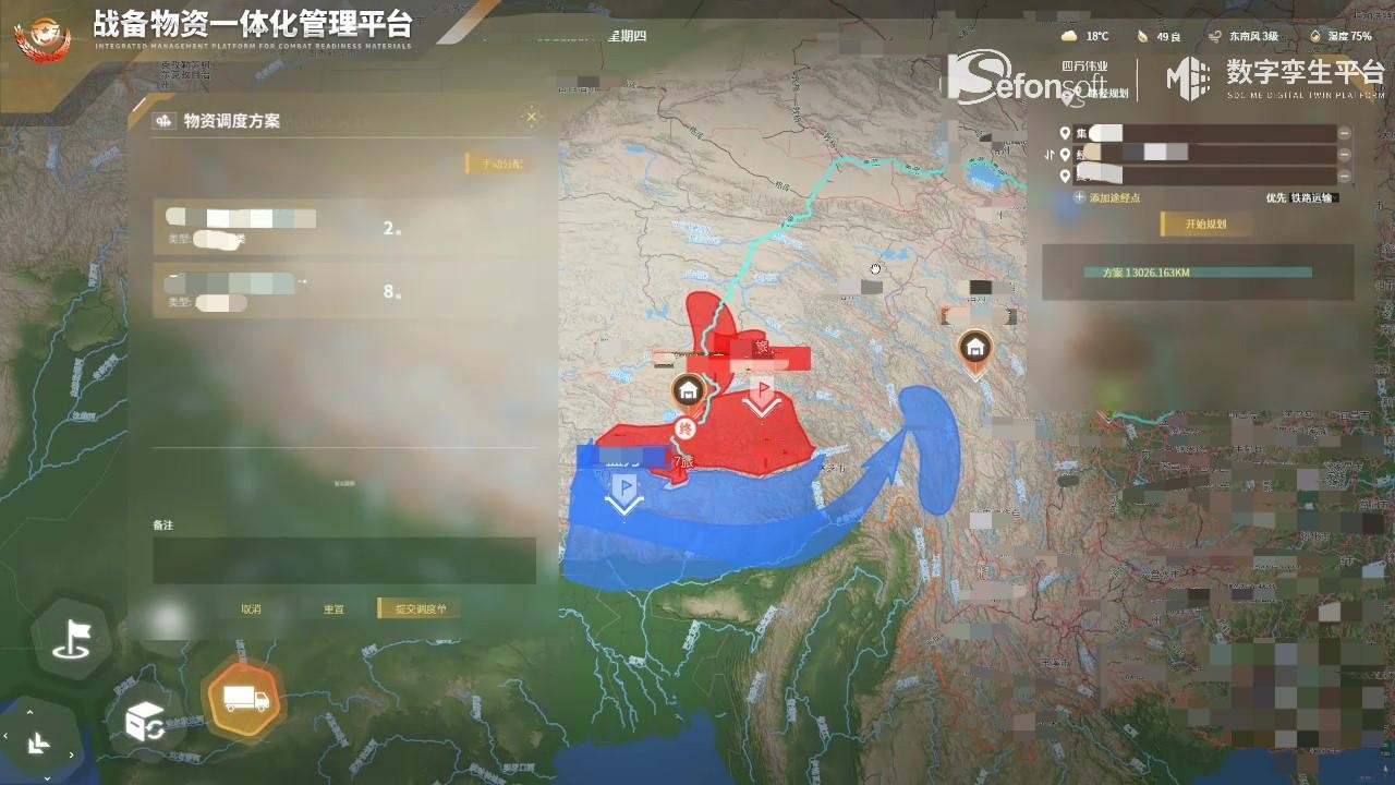 结合GIS与空间数据库,自定义规划物资运输路径,包括起始点及途径点,可主动避开封锁区域及危险区域,支持设定优先公里运输或铁路运输。结合仓库实时库存数据,根据设定的运输路径自动分配最近的仓库,支持用户手动分配仓库。