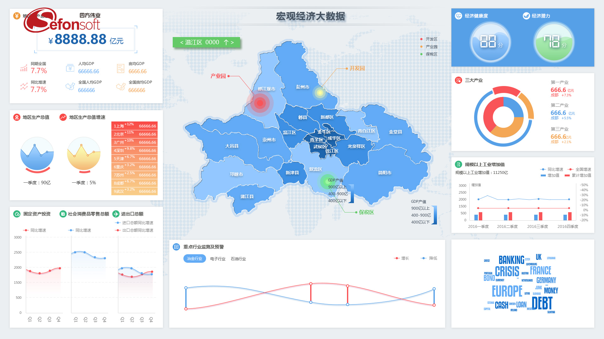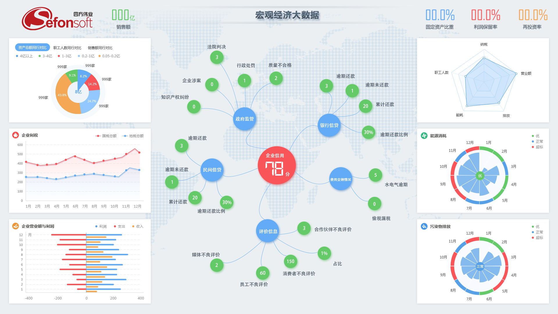 宏观,即站在一方政府经济各项指标的总体态势上,提供总体统计分析和决策支持;中观,即站在某一个行业的视角上,透视行业的热度、价值、产业布局和经济效益;微观,即站在具体企业的视角,精确对企业运行状态和经济效益进行透视和评估,进而进行精准监管。