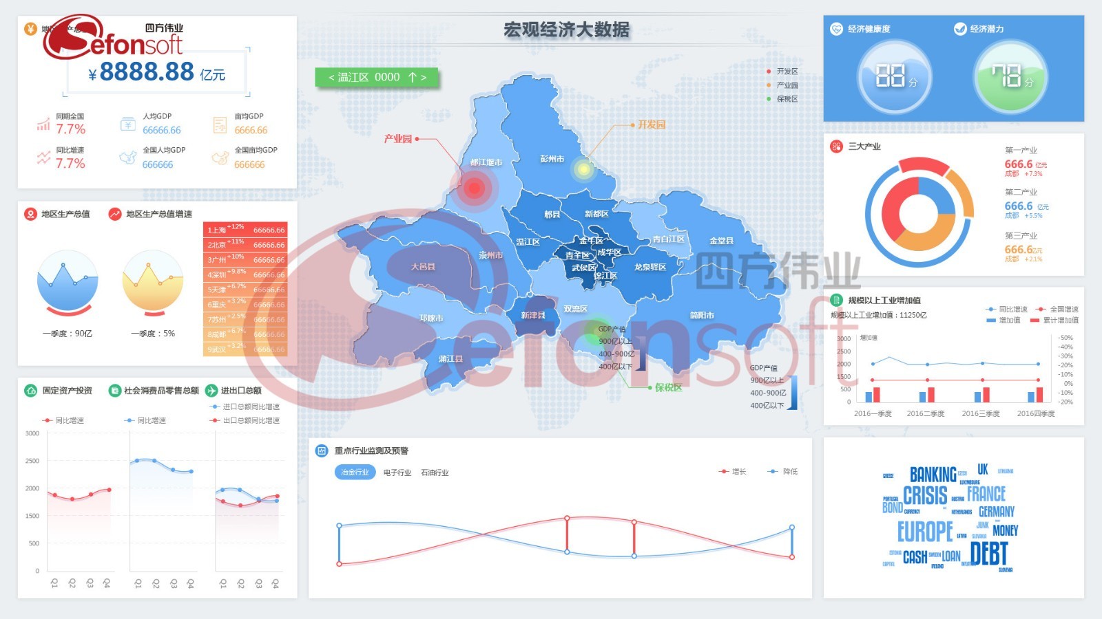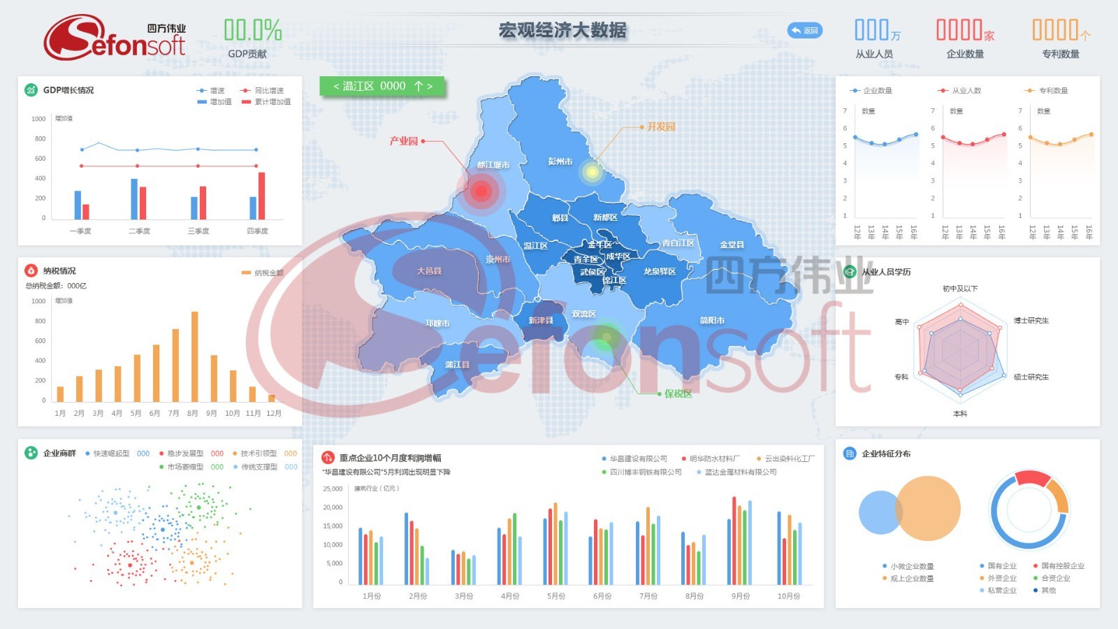 To address the limitations of Smart City IOC projects—where applications are often superficial, underutilized, and with unclear value—cross-departmental, city-wide data application scenarios are being explored. Using local government economic situation analysis and scheduling meetings as a breakthrough scenario, the Economic Operation Analysis System is designed to establish a monitoring, early-warning, and analytical framework for local economic operations. It supports economic performance analysis and report preparation on key economic indicators, improving the efficiency and quality of economic reporting. This provides leaders with comprehensive, timely, accurate, and reliable insights for decision-making, enhancing the precision, timeliness, and visual clarity of economic monitoring and analysis.